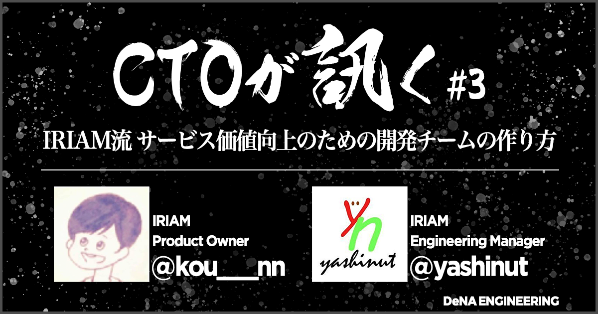DeNA CTO の小林です。今回、今年8月に DeNA の仲間になった IRIAM のサービスの紹介をしたいと思います。今回は IRIAM から二名の方に来ていただいています。