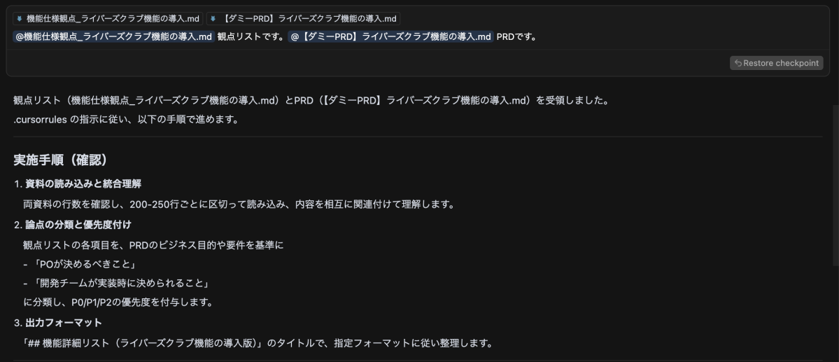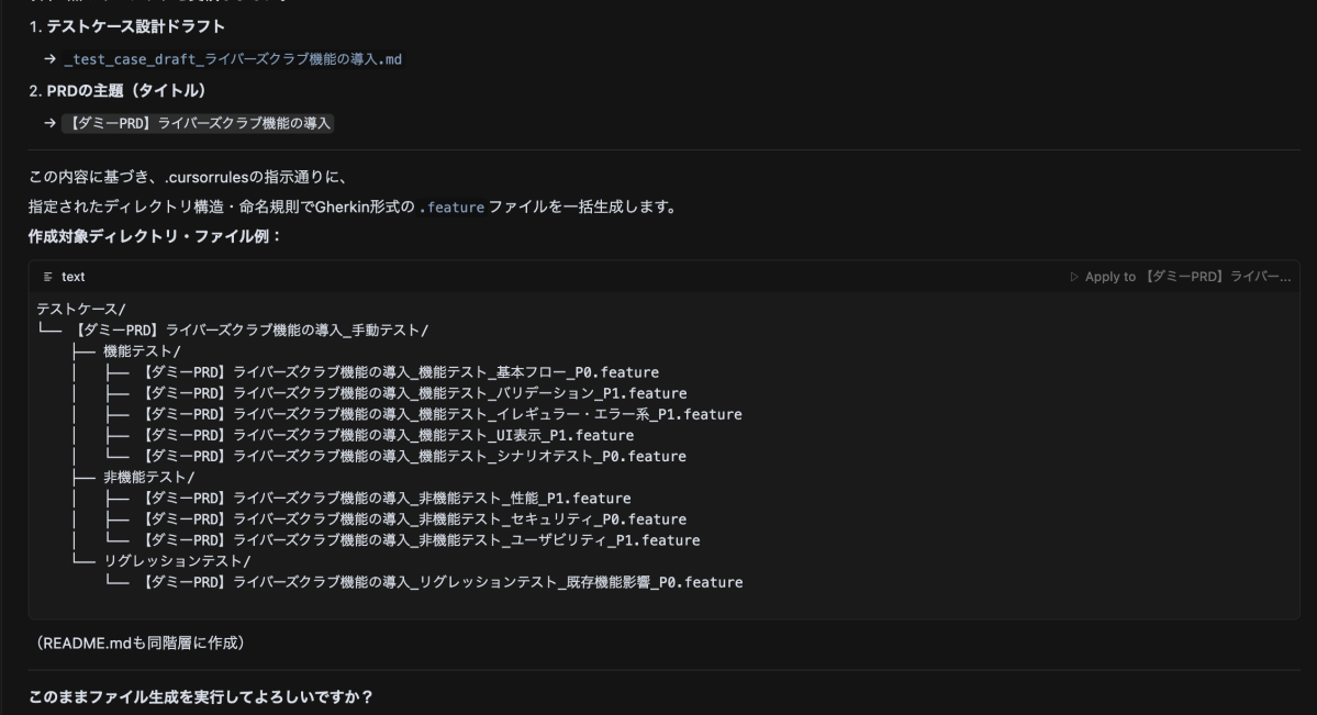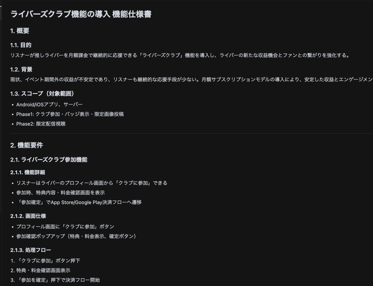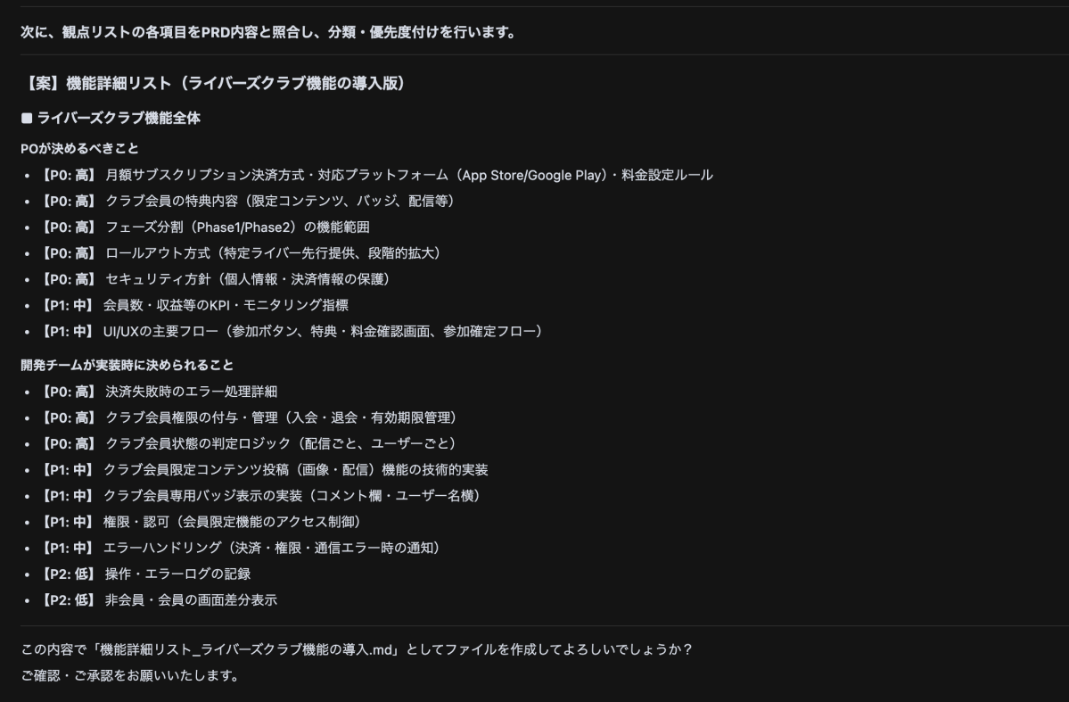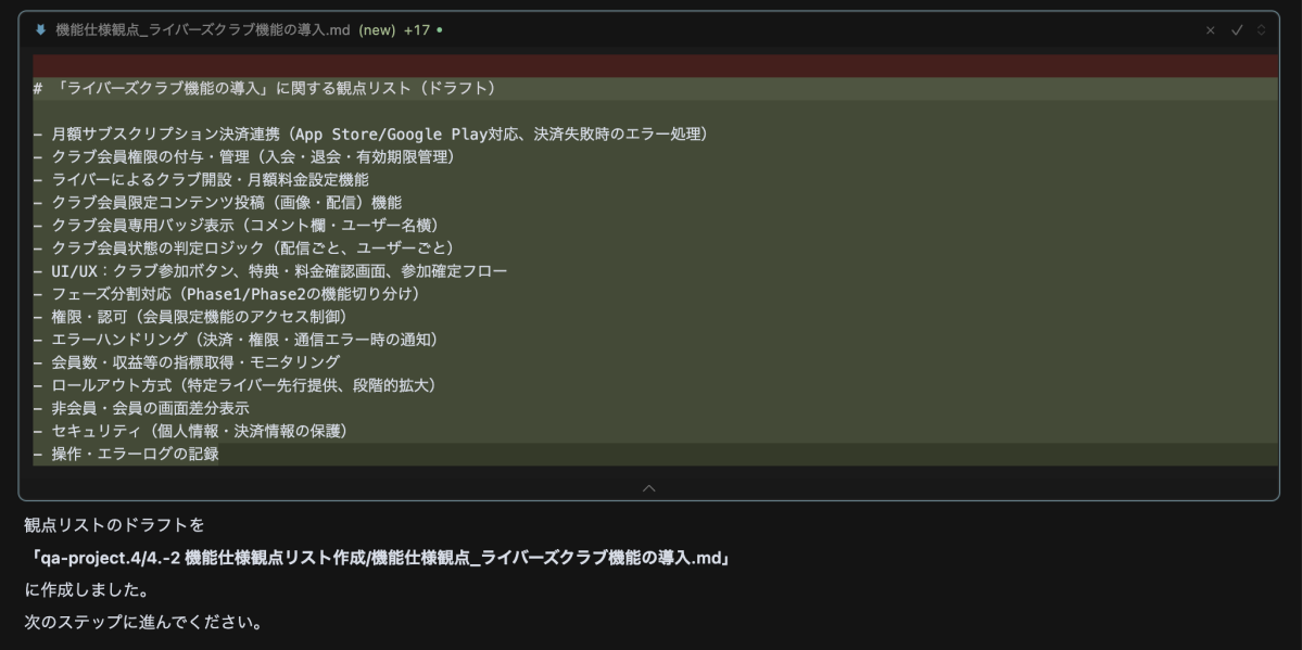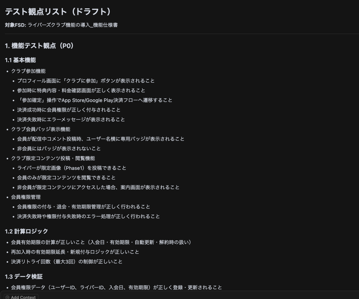このように、一連のプロセスを通じて「ライバーズクラブ機能」のダミーPRDから、具体的なテストケースまでを体系的に作成することができました。