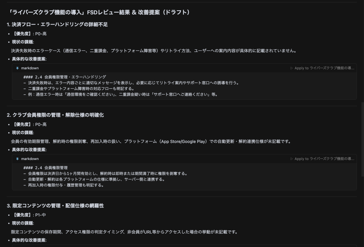 - レビュー結果を基にFSDの個別改善を対話的に実行