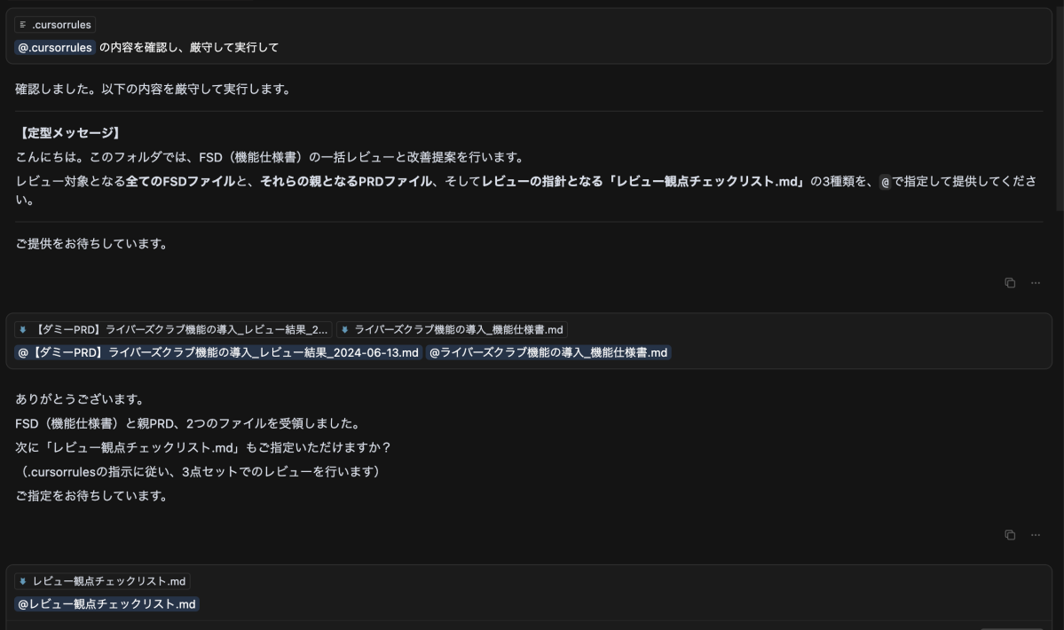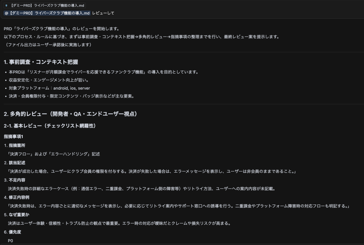 例えば、AIに「PRDレビューをお願い」と頼むと: