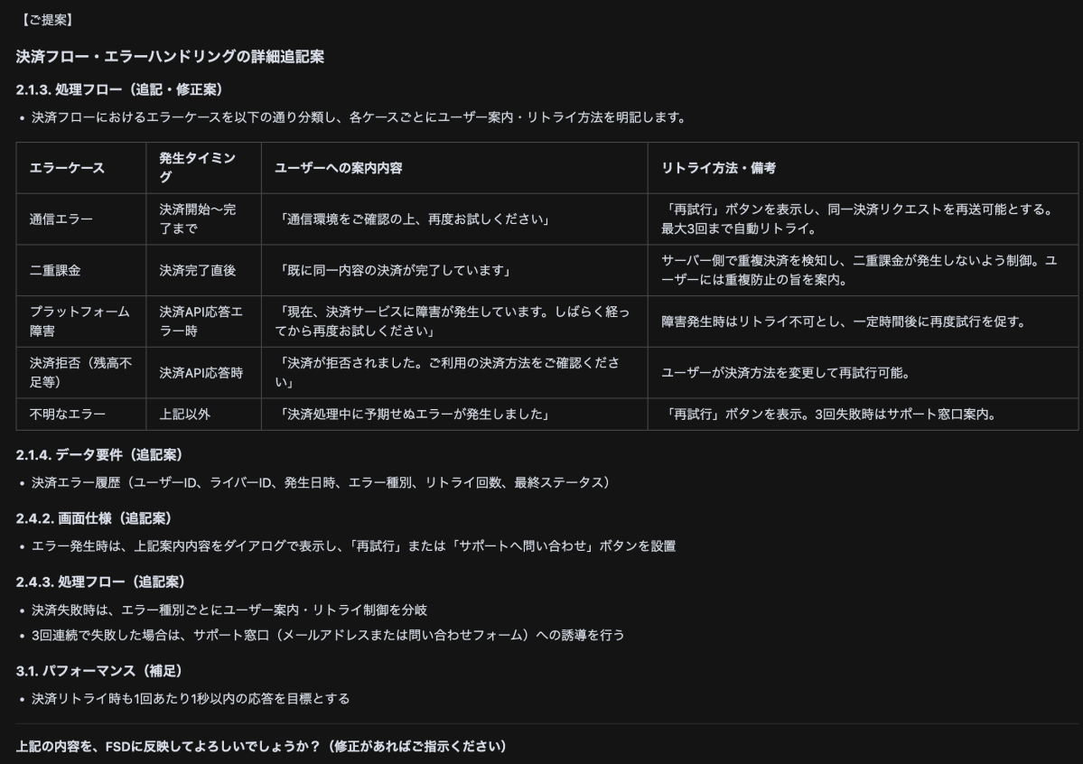 「提案の粒度とフォーマットのお手本.md」を活用し、課題の明確化、観点別の整理、具体的な提案内容を「検討項目」と「提案」のセットで構造化し、開発者が迷わないレベルの明確な仕様定義を提供しています。