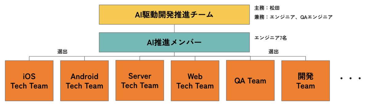 AI推進メンバー:各Techチームや成熟度の高い開発チームそれぞれから1~2名選出。技術的な知見を活かした実践的なアプローチを行なっています。ツール使用可否やトライアルの実行など権限を一部委譲するなど、ボトムアップで活動しやすい体制にしています。