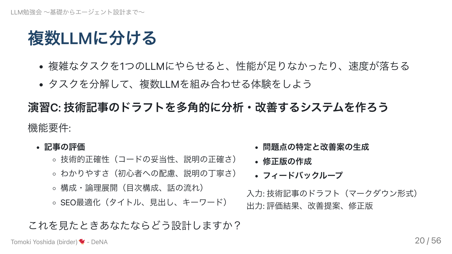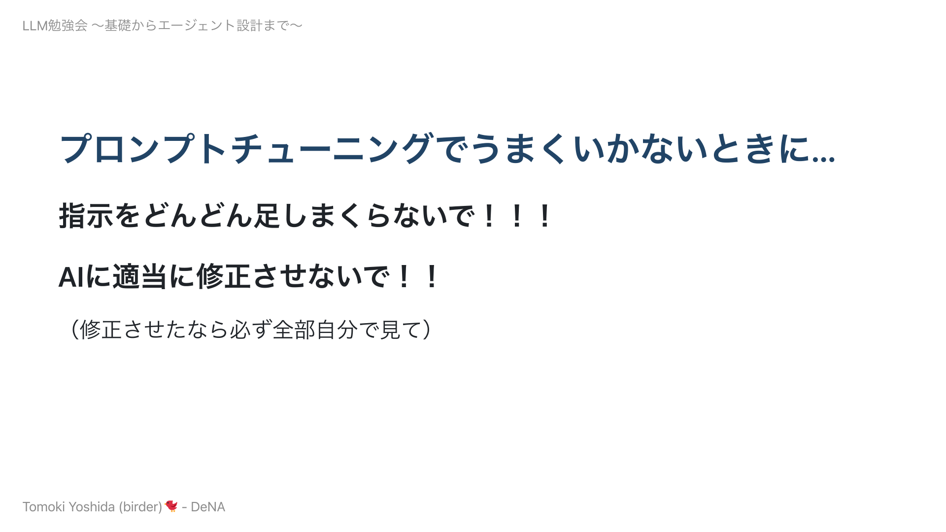 また、保守運用・チューニング観点では、プロンプトに指示を足し続けるのではなく、全体を見直す重要性を強調しました。