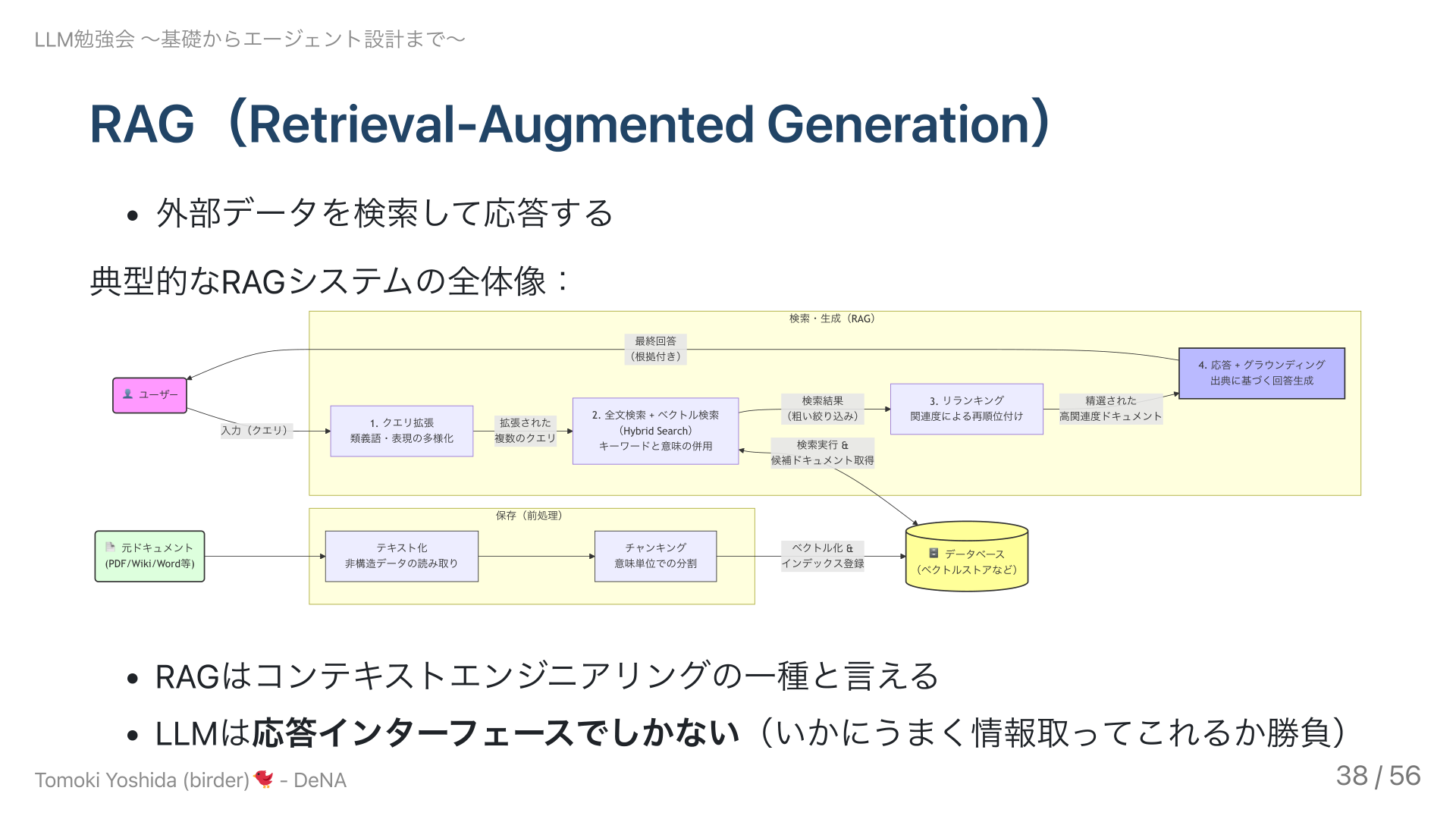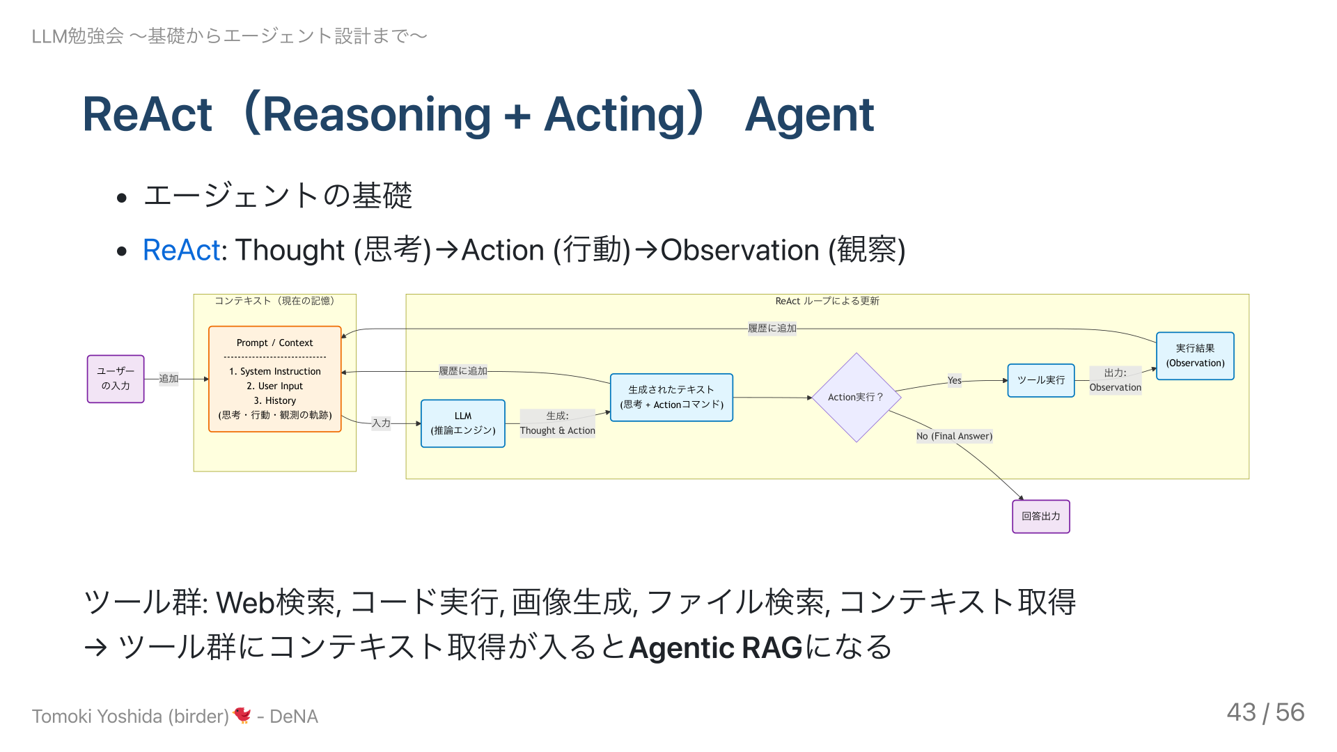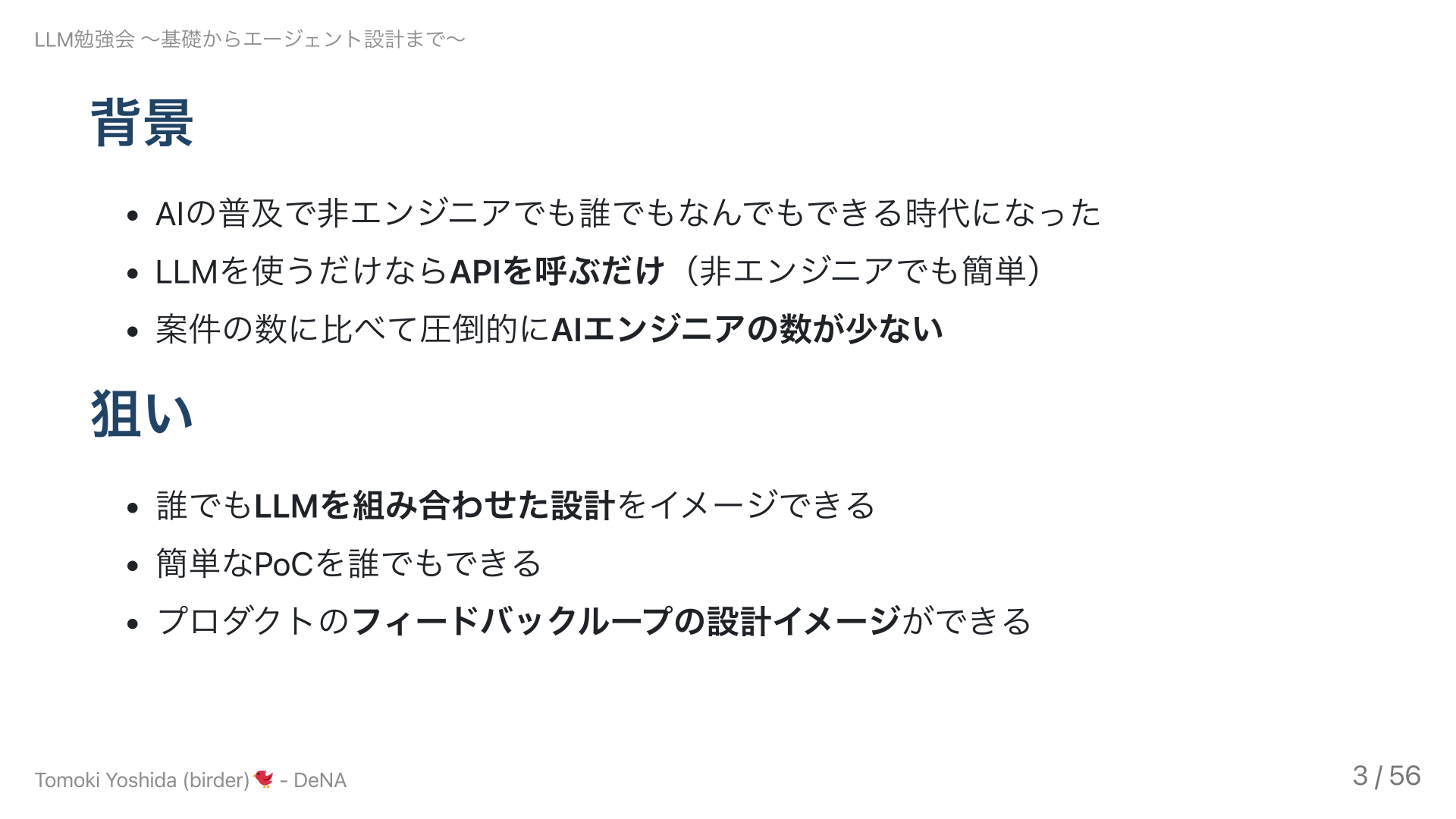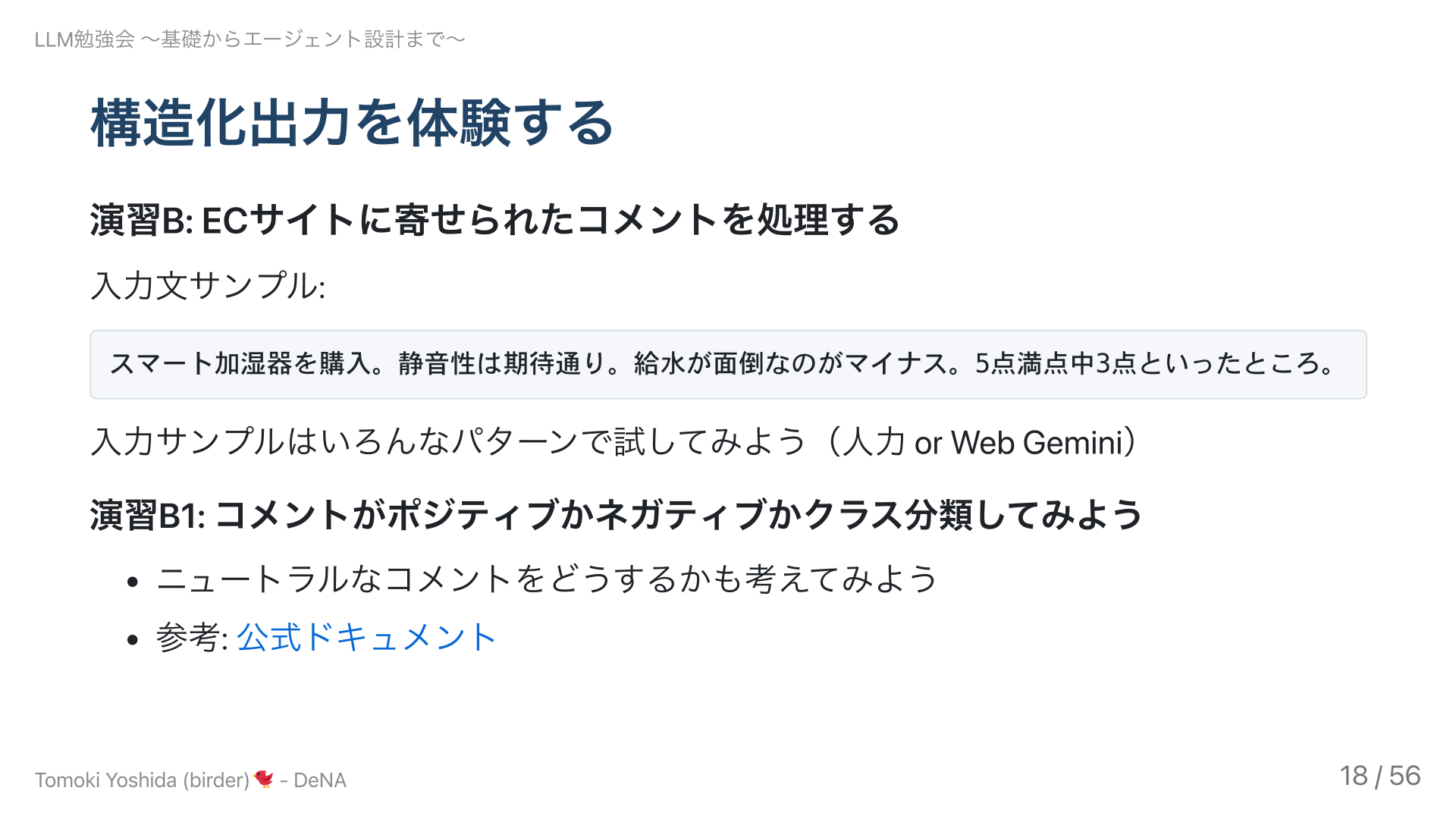 勉強会は約3時間の構成で、LLMの基礎知識(Next Token Prediction、Instruction Tuning、Reasoning、プロンプトエンジニアリング)から始まり、実践的なハンズオン(API呼び出し、構造化出力、複数LLMの組み合わせ)を経て、プロダクト開発に必要な応用知識(強化学習、ファインチューニング、コンテキストエンジニアリング、RAG、ReAct/Reflexionなどのエージェント)から発展的なハンズオン(マルチモーダル入力、グラウンディング、コード実行、Tool Calling、Embedding、Deep Research設計、ReAct Agent、n8n、LangSmith)まで体験できる内容になっています。
