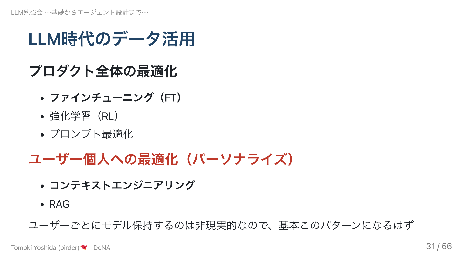 LLMを使用したプロダクト作りにおけるデータ活用の基本的な考えを示し、ファインチューニングと強化学習の違いについて解説しました。