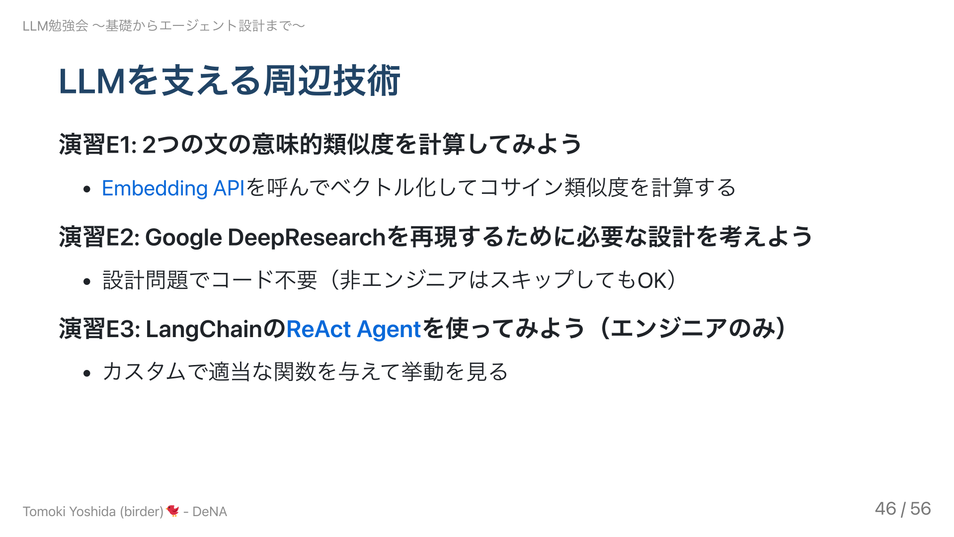 さらなるAPIのオプションとして、マルチモーダル入力やコード実行、グラウンディング、Tool Callingなどを体験した後、Embeddingを呼んでコサイン類似度を計算してみる演習や、Deep Researchの内部構造を考えてみるといった演習を実施しました。