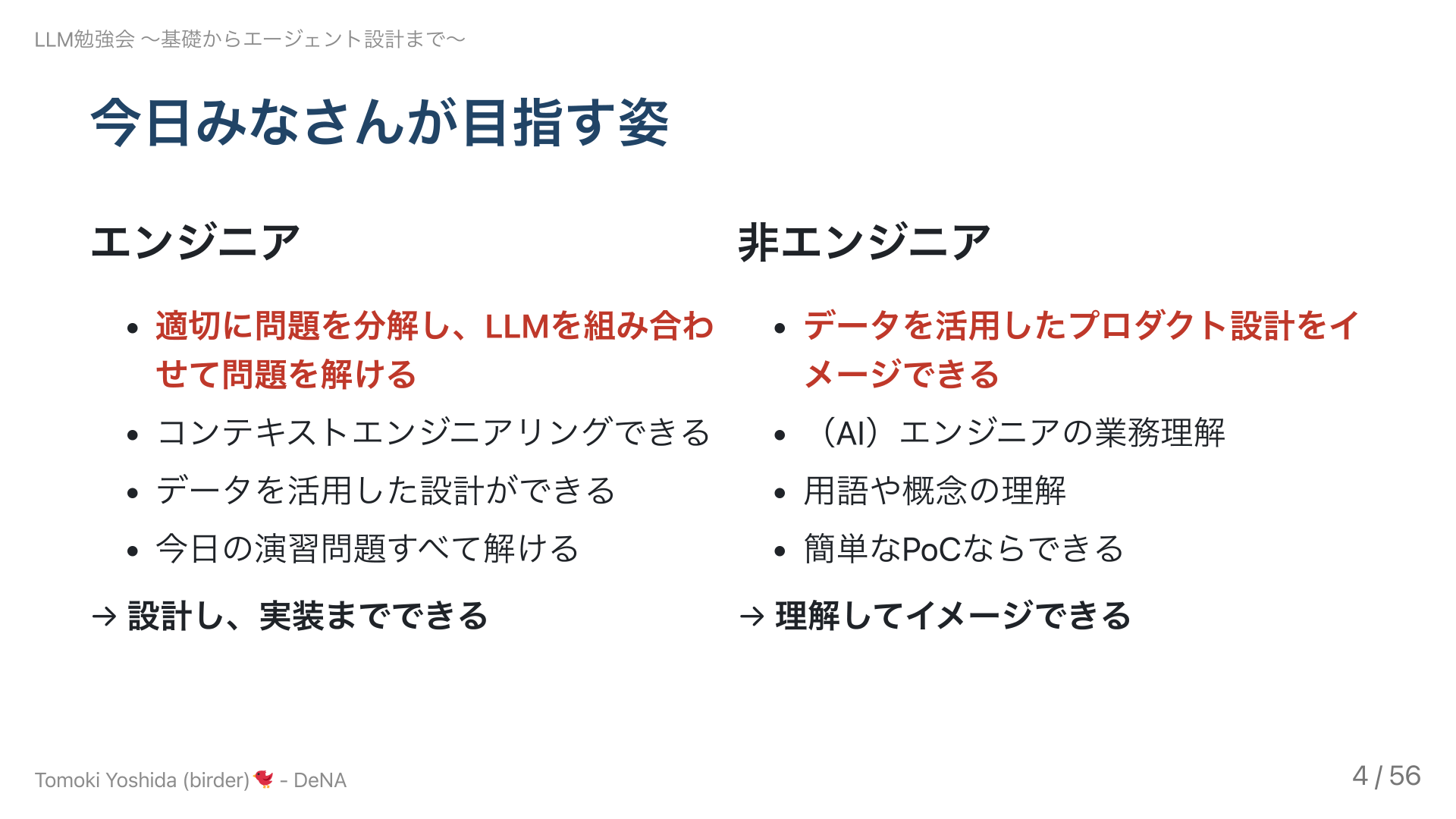 本勉強会の目的と狙いを伝えた上で、エンジニアと非エンジニアで異なるゴールを設定しました。