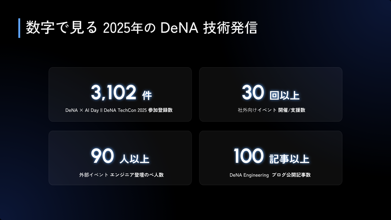 以上、2025年の DeNA 技術発信を振り返りました。「AIオールイン」宣言がされたカンファレンスイベントから始まり、イベント開催、スポンサー協賛、海外カンファレンスでの登壇、ブログ発信などなど、濃密で熱量の高い一年になりました。社内のエンジニアたちが学び、挑戦し、その成果をオープンに共有する——そんな好循環を引き続き、技術広報チームとしてもサポートしていきます。