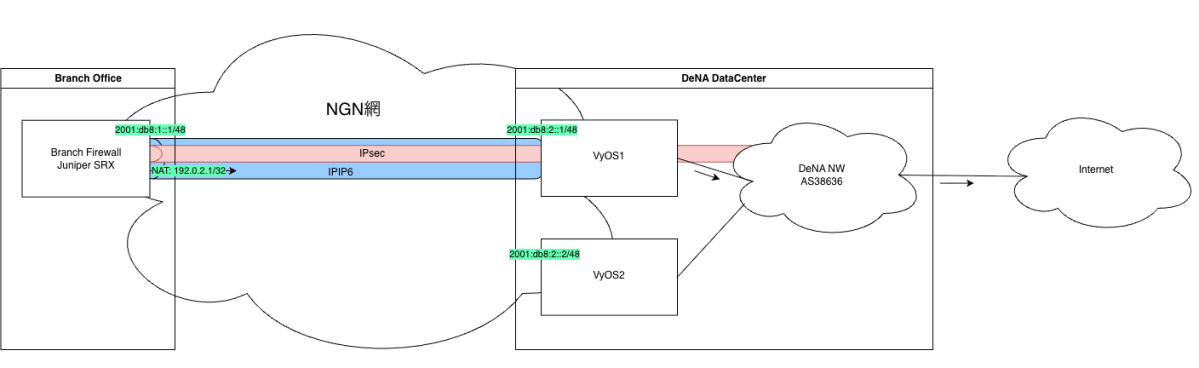 実はJunos22.2以降でIPIP6に対応できるようになったため, サーバの排除が可能になりました. そしてDC側をUbuntuからVyOS5に置き換えました. VyOSはオープンソースのファイアウォールです. VyOSを選定した理由としては, 更新が活発であること, CLIがチーム内で馴染みのあるJunosライクであることが挙げられます. 当然ですがUbuntuで構築していたときと比べ圧倒的に設定はシンプルになりました. 同時に設定見直しを実施し, IPsec VPNはトンネル内に収納する形に変更しました. 機能的には変わりませんが, こっちのほうがシンプルです.