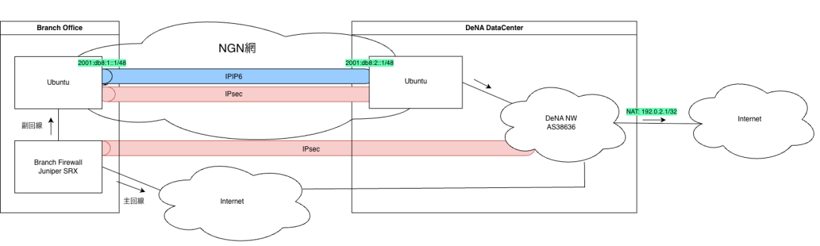通信経路としては拠点FirewallからUbuntuを経由しDCでNATしてインターネットへ出る流れになります. DeNAはCloud Journey3前までは大規模なオンプレミス運用をしており, その名残りで今もASを保持し運用しています. 現在はオンプレミスでのサービス提供はなく, IPアドレスが多少余っているためその資源を活用した形になっています.